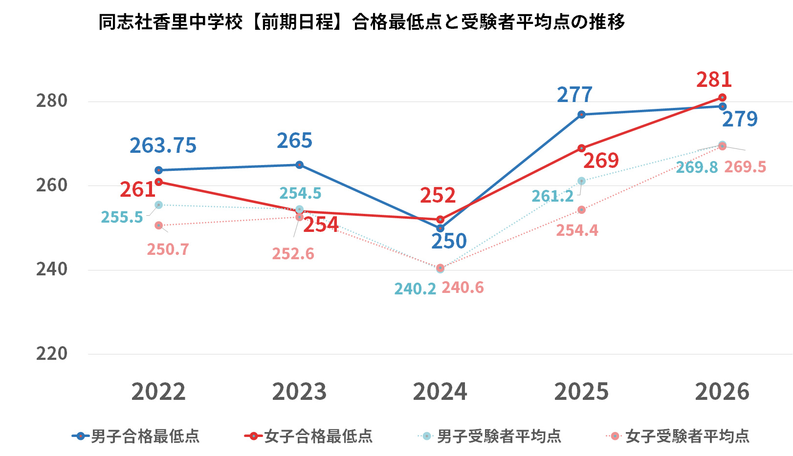 男子の算数差分が18.00点と、前期としては異例の開きを見せた年です。合格最低点も前年より20点以上上昇(男子277点)しており、アラカルト方式の恩恵を最大限に活かせる「算数得意層」が、一気に入試を有利に進めました。