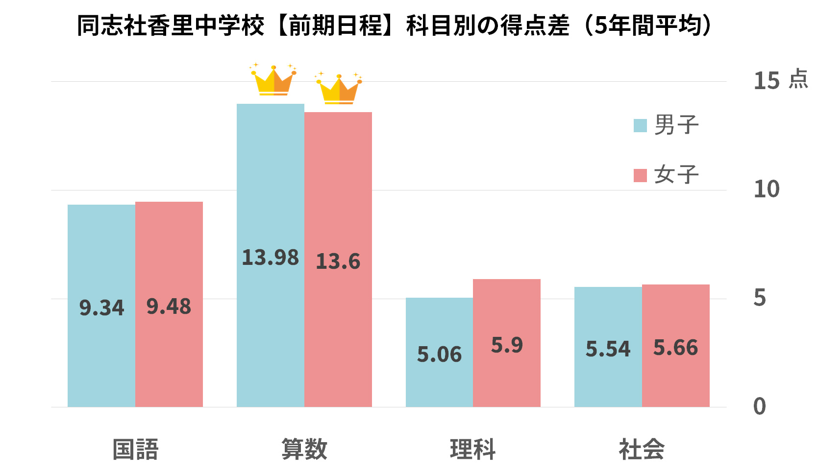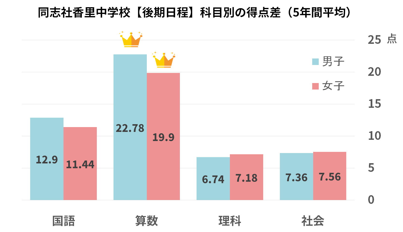 - 衝撃の事実: 男子の算数は 22.78点、女子でも 19.90点 の差がついています。理科や社会の差(約7点)の3倍近いインパクトがあり、「算数で勝負が決まる」という現実がこれ以上ないほど明確に伝わります。